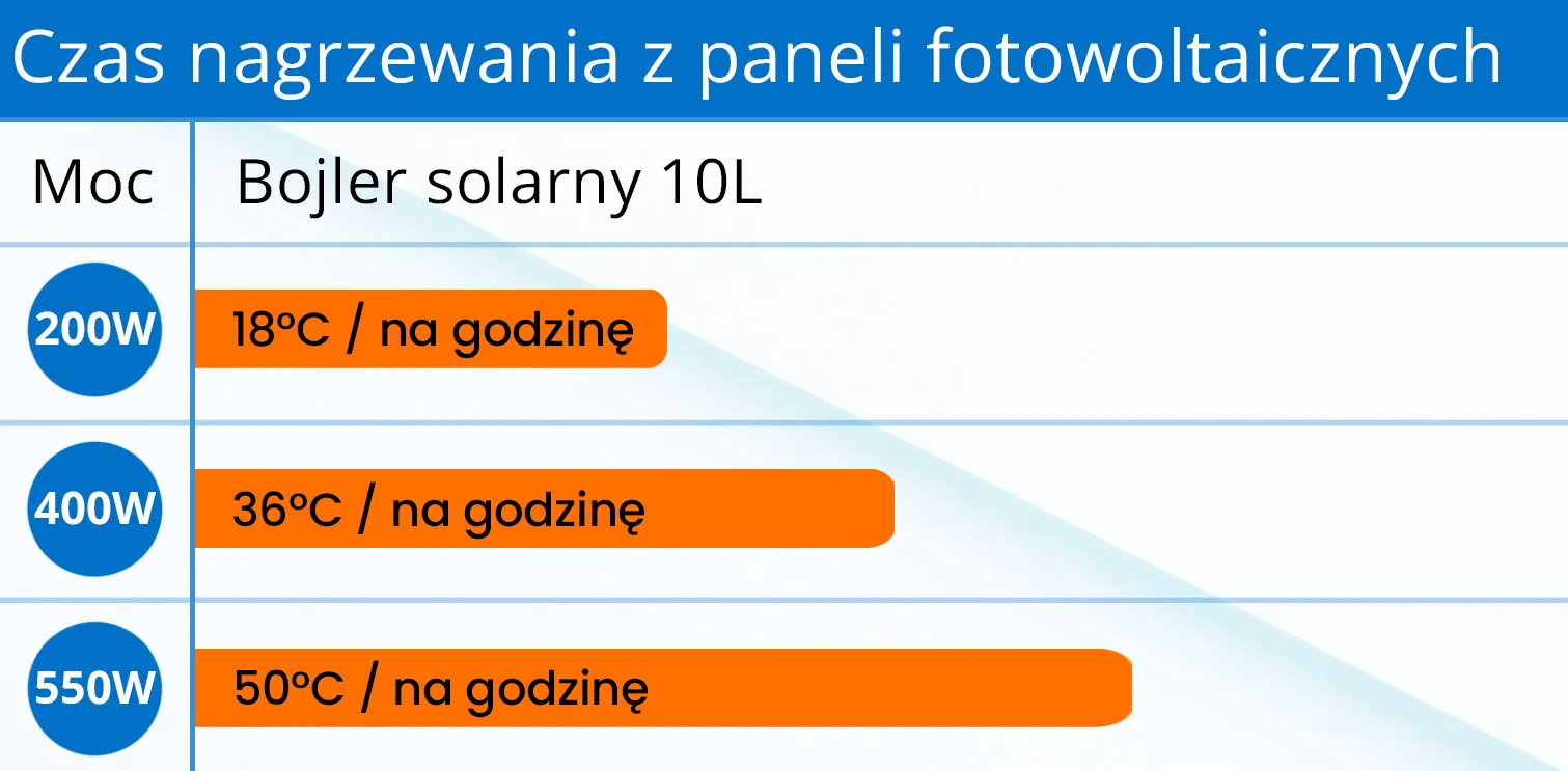 • Efektywna moc grzewcza z paneli fotowoltaicznych - Bojler wykorzystuje energię z paneli PV o mocy do 550W, umożliwiając szybkie podgrzewanie wody.