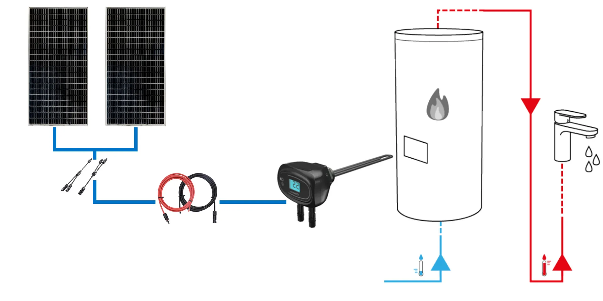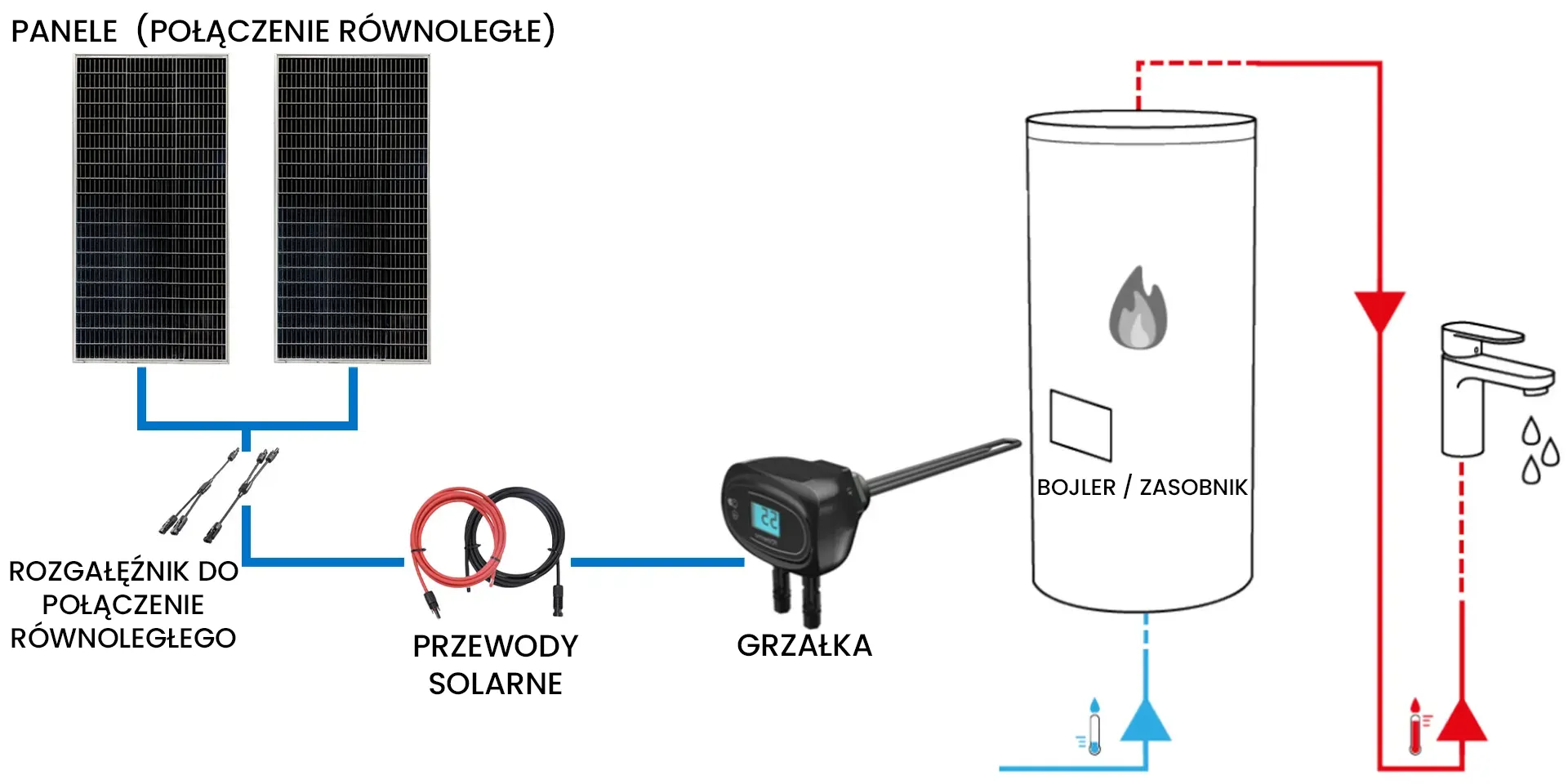 - Prosty montaż - Instalacja grzałki wymaga jedynie wkręcenia do zbiornika i podłączenia paneli za pomocą złączek MC4.