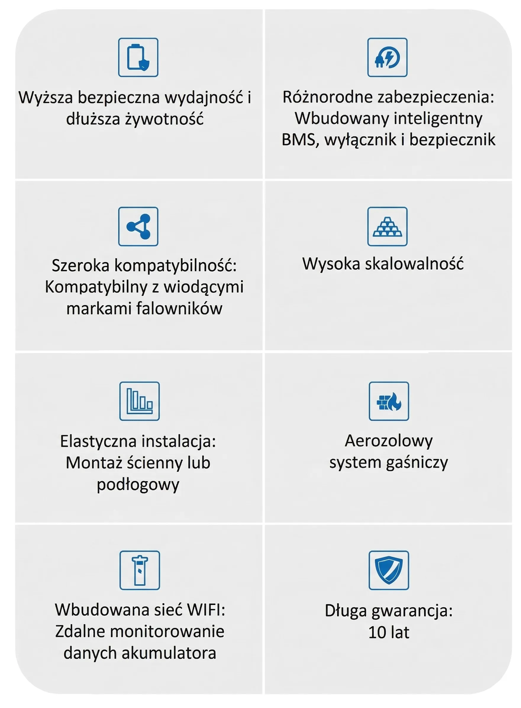 - Kompatybilność z falownikami – Akumulator współpracuje z szeroką gamą falowników, co ułatwia integrację z istniejącymi systemami energetycznymi.