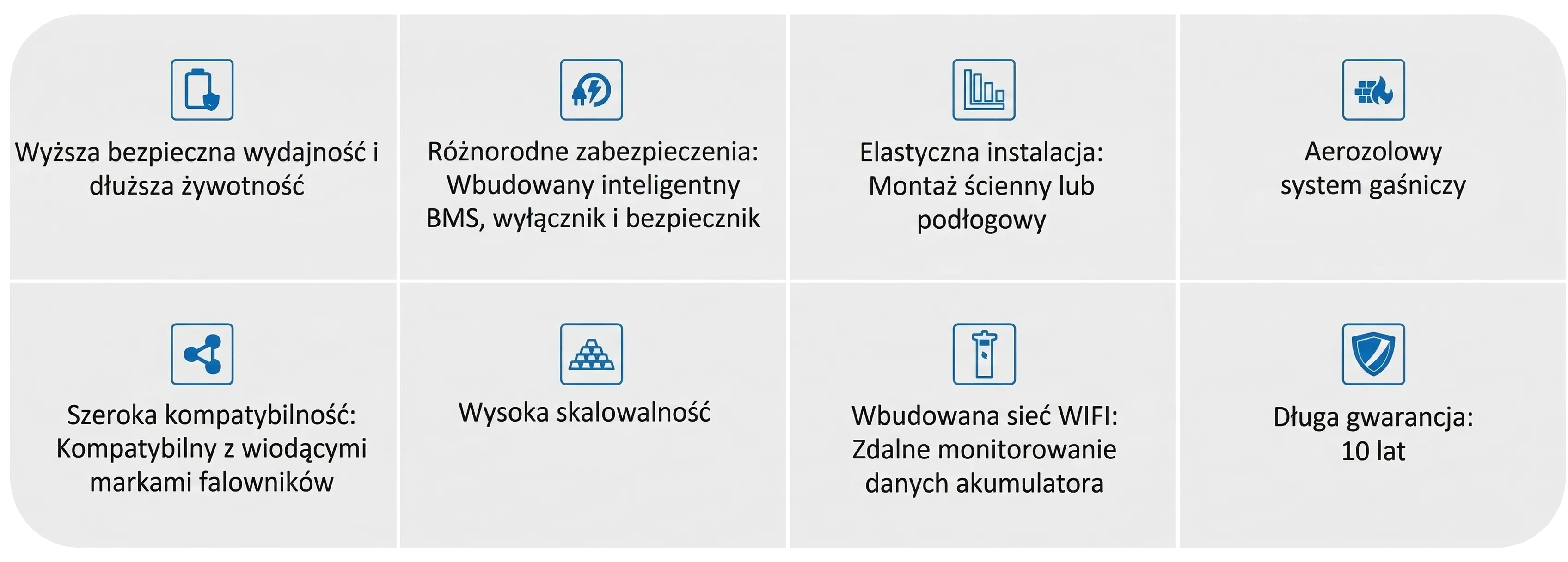 - Wysoka wydajność energetyczna – Akumulator umożliwia efektywne przechowywanie energii, minimalizując straty.