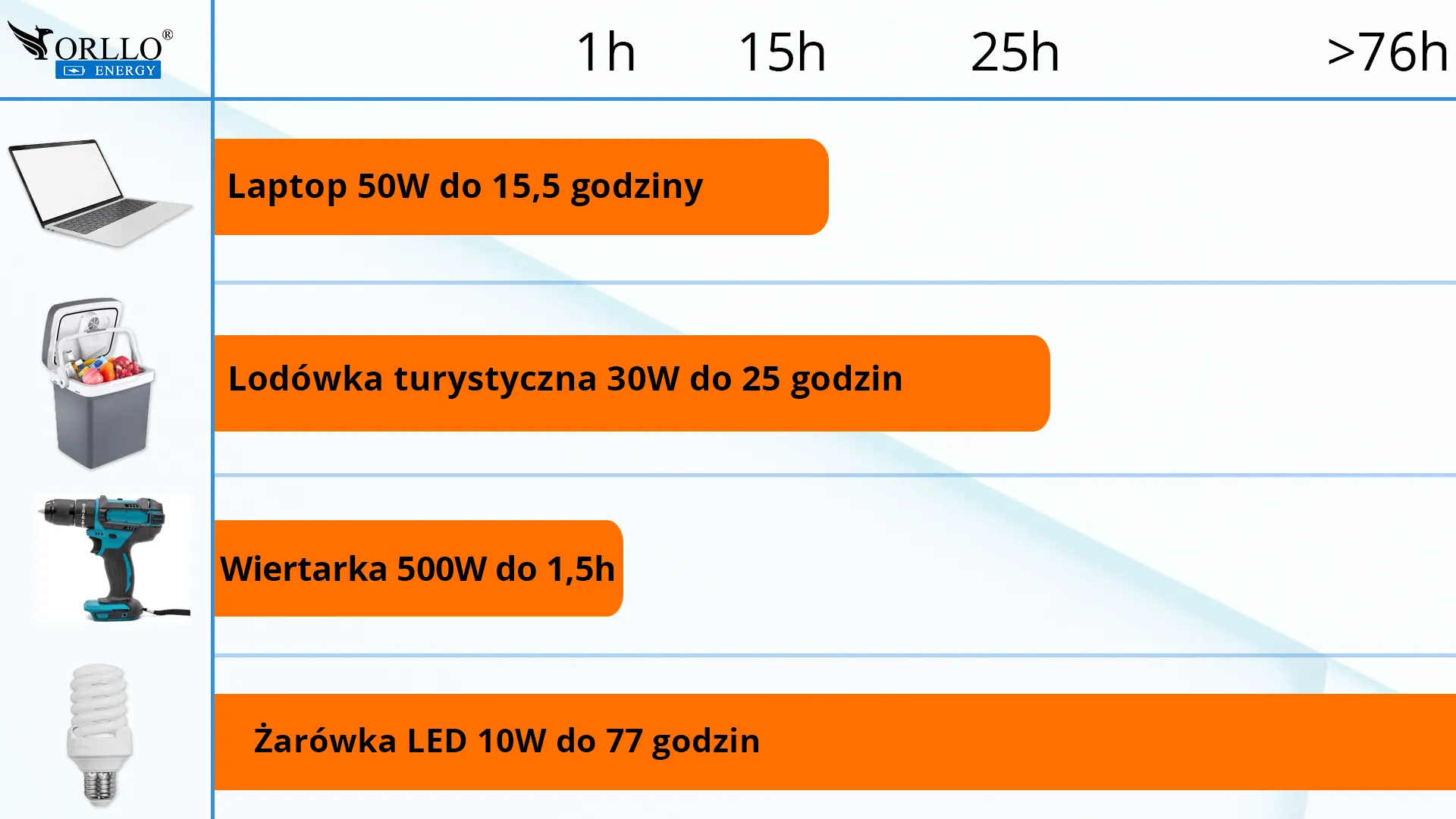 Czasy podane w tabelce mogą się różnic, zależne są od temperatury, podłączonych urządzeń, czasu pracy przenośnej stacji.
