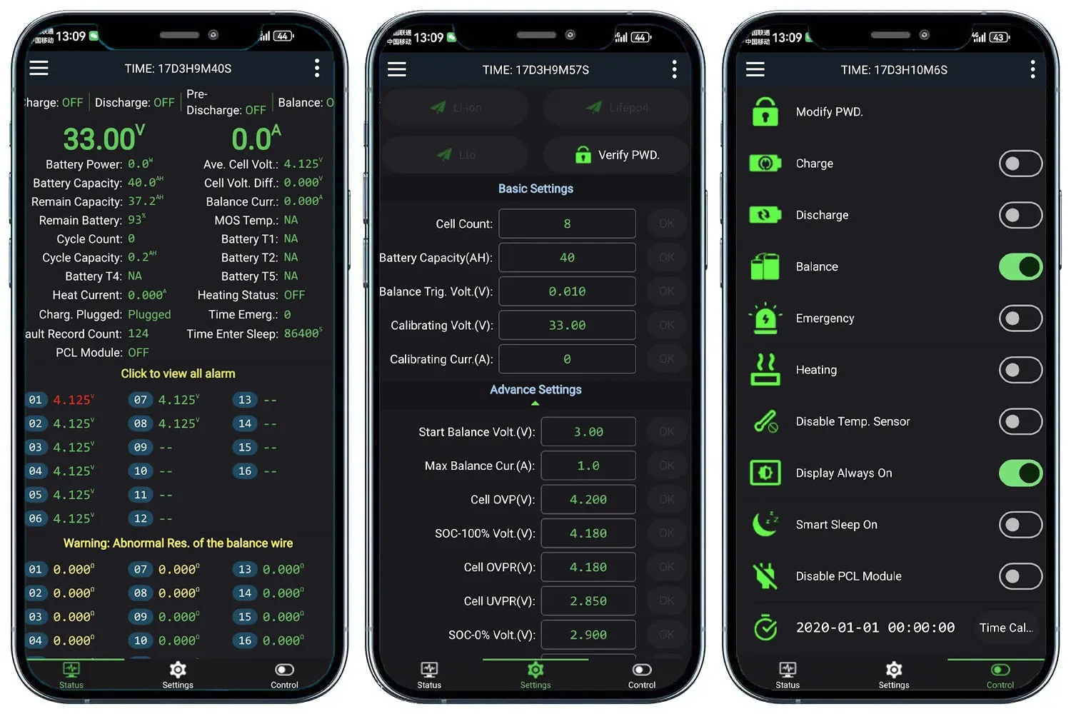 Aplikacja JK BMS: Monitorowanie parametrów w czasie rzeczywistym: śledzenie napięcia, prądu, temperatury i stanu ogniw; konfigurację ustawień: dostosowywanie parametrów balansowania i ochrony. Intuicyjny interfejs użytkownika: łatwa obsługa i szybki dostęp do informacji.
