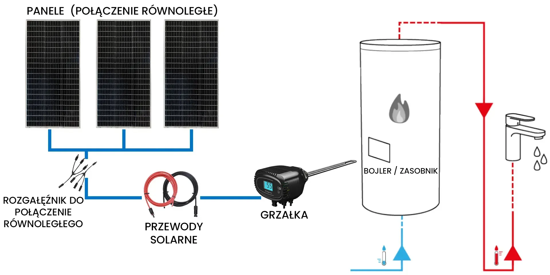 - Prosta instalacja - Montaż sprowadza się do wkręcenia grzałki w zbiornik i podłączenia paneli za pomocą złączek MC4, bez dodatkowych urządzeń i formalności.