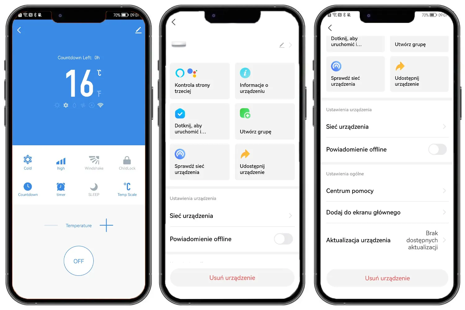 - Powiadomienia w Polskiej aplikacji na telefon - np. alarm pełnego zbiornika wody w trybie osuszacza.